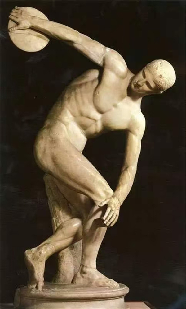 作品人物動作緊張,全部力量集中于鐵餅,顯示下一秒強(qiáng)大的爆發(fā)力,強(qiáng)烈地感受到作品的運動感,打破時間的局限性,但人物面部表情沉靜,使觀看者感受到運動員的自信穩(wěn)定。