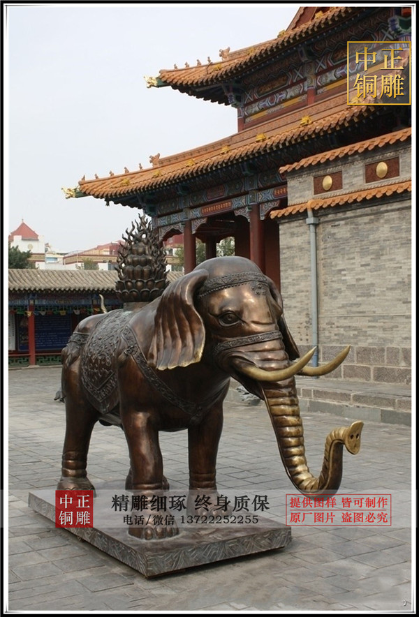 銅大象在印度、泰國稱為“象神”,大象的鼻子可吸水象征可把外面的財吸進來,銅大象擺放在公司門口或家里都有招財作用,其中背馱金蟾的大象謂之“向上發(fā)財”。因為萬象更新的“象”,諧音“祥”、和“相”,古人云:“太平有象”,寓意“吉祥如意”。