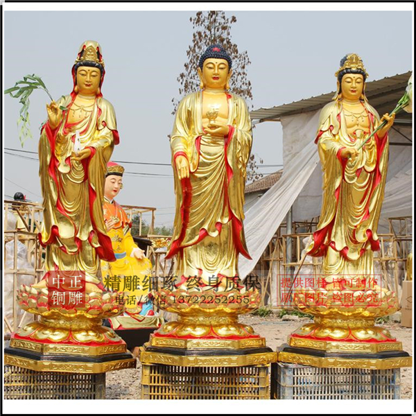 在西方三圣的塑像或者畫像中,中間是阿彌陀佛,佛的左邊是觀世音菩薩,右邊是大勢至菩薩。佛的形像一般是結(jié)手印,或者手捧一個蓮盞,代表阿彌陀佛接引眾生的心;觀世音菩薩手里拿一個楊枝凈瓶:瓶中甘露常遍灑,手內(nèi)楊枝不計(jì)秋;大勢至菩薩則是手執(zhí)長柄的蓮花,代表智慧的大勢遍至十方。中正銅雕-1.6米高西方三圣銅像、1.6米高西方三圣銅像價(jià)格、1.6米高西方三圣銅像廠家,觀世音菩薩法號“正法明如來”,因悲心廣大,才倒駕慈航,來救無邊眾生。觀世音菩薩在釋迦牟尼佛在娑婆世界教導(dǎo)眾生的時候,又來幫助釋迦牟尼佛行教化眾生。